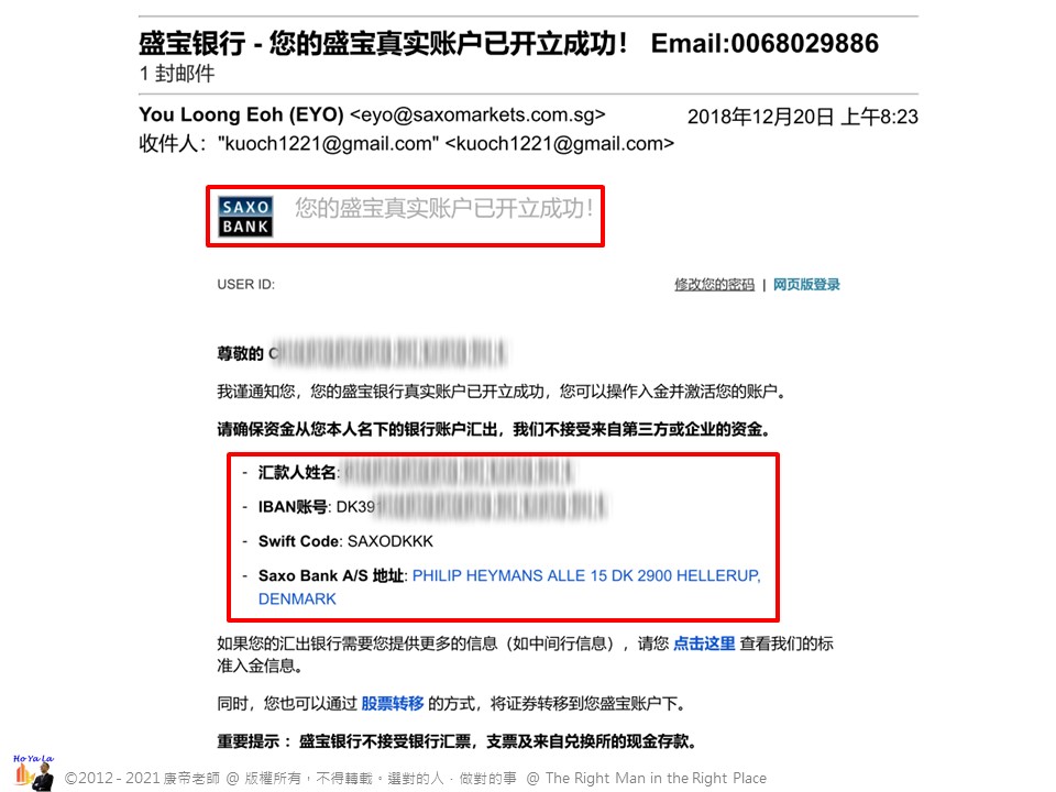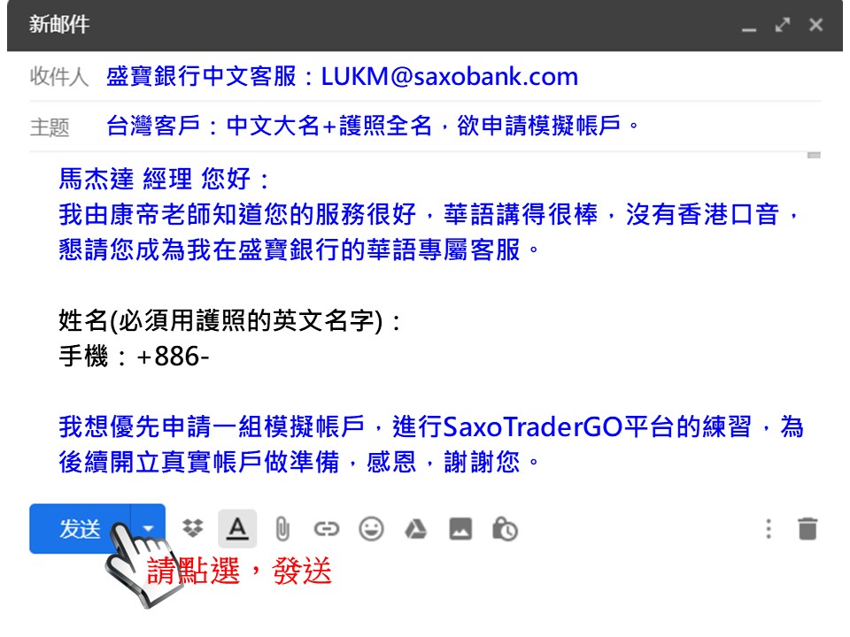 帳戶經理:馬杰達 LUKM@saxobank.com,辦理開戶,享「丹麥總行存款銀行戶+全球投資交易戶」二合一帳戶,請留意務必要用自己熟悉的Gmail信箱寄信給劉經理。